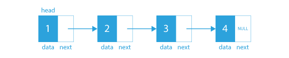Every node stores the data and address of the next node. Every node consists of 2 parts: