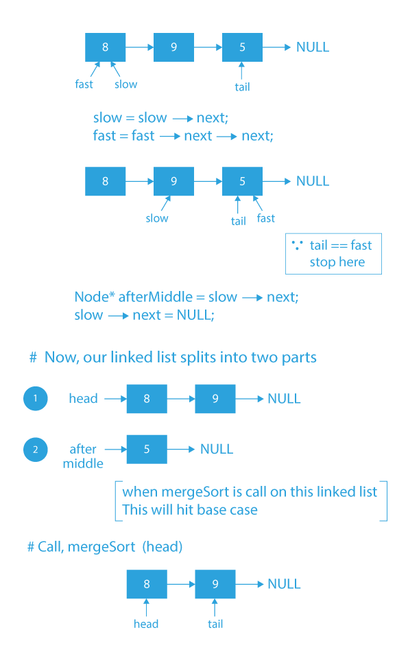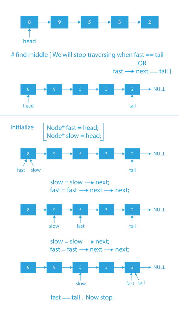 - And when the fast pointer reaches the tail, the slow pointer will be at the middle of the linked list.