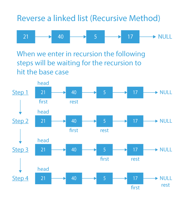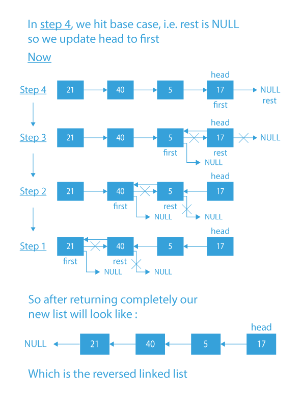 - If there are more than 1 node, i.e. not the base case, we will recursively call the function with rest as the new head and original head reference.
