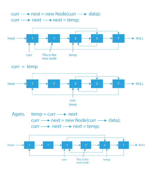 - Similarly, we will create a copy of 2nd and will insert it between 2nd and 3rd node. We will continue in this manner and add the copy of node Xth between Xth node and (X+1)th node. The example given below will help you to understand this step better.