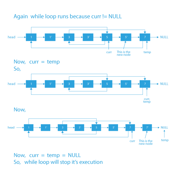- If A -> B -> C is our original linked list, then the linked list after the above steps of adding a copy of Xth between Xth and (X+1)th node will be A -> A’ -> B -> B’ -> C -> C’.