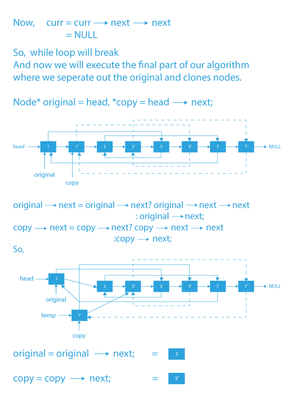 - Now we will restore the original and cloned linked lists in a below manner by using a single loop.