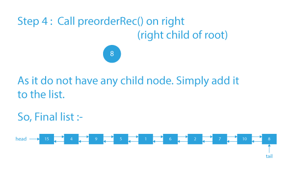 – We need to traverse the given tree using preorder traversal and insert the nodes in our Doubly Linked List following the preorder traversal of the tree.