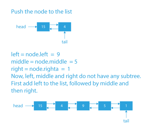 – The left pointer of a node in ternary tree will act a prev pointer in the Doubly Linked List.