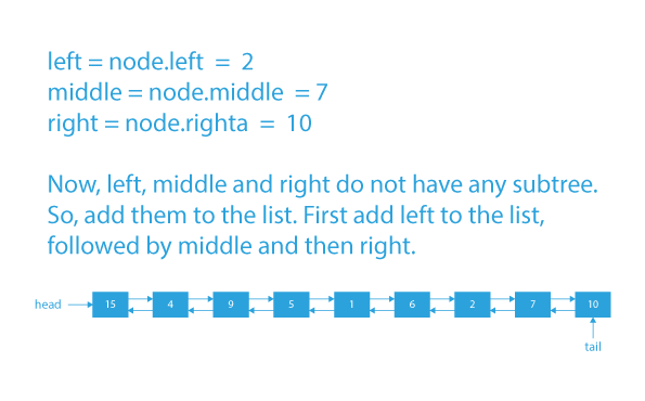 The binary tree is a tree data structure in which each node has at most two children nodes. This can be achieved by traversing the tree in the in-order manner, that is, left the child -> root ->right node. Traverse left subtree and convert it into the doubly linked list by adding nodes to the end of the list