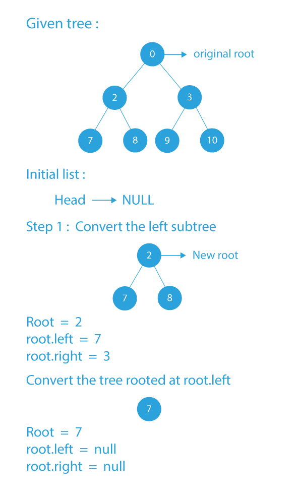 - A subtree follows all the properties of the parent tree. So this problem is similar to the original problem. We treat the left child of the root as the new root and convert the subtree rooted at the left child (left child of the left child of the original root) of the new root (left child of the original root) and then convert the new root and then the subtree rooted at the right child of the new root.