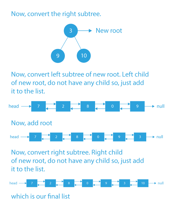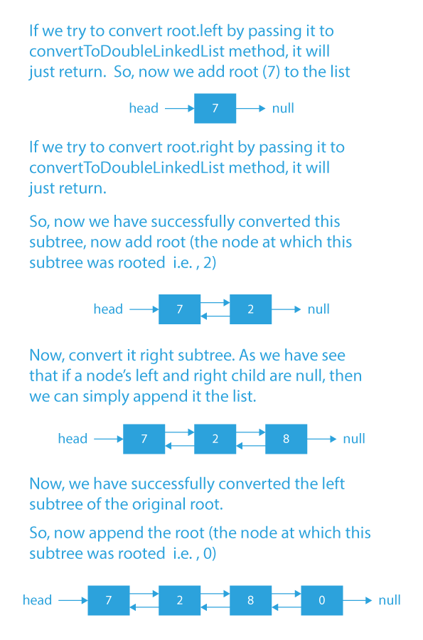 - Call the method convertToDoubleLinkedList() on the right child of the root node (the node which is passed to the convertToDoubleLinkedList method). This will convert the right subtree rooted at the root node by recursively calling all the subtrees rooted at the root.left as well as root.right and append the list to the final output list.
