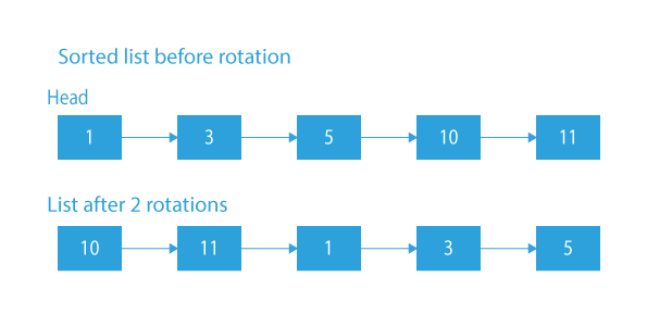 Explanation: We can see that if we add the first two elements to the end of the linked list, it becomes sorted. Hence, 2 rotations is the answer.