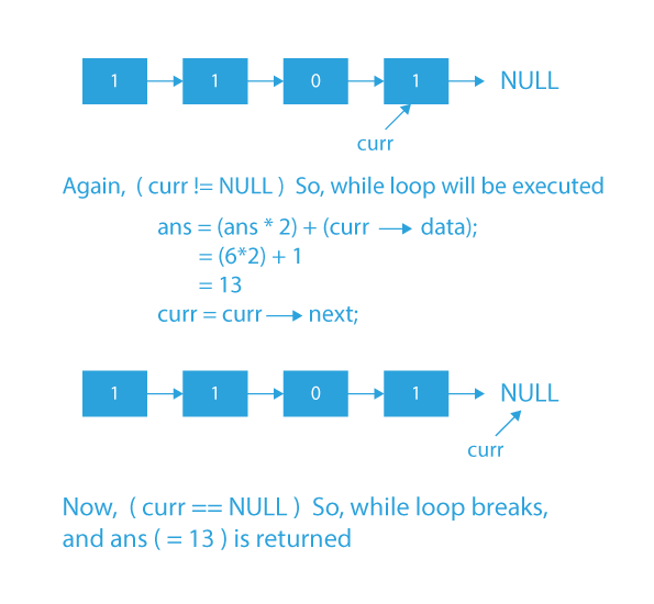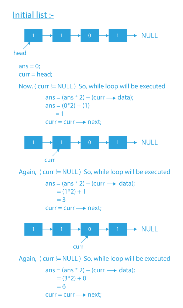 - Every time inside the loop, multiply the ans by 2 and add the curr->data in ans.