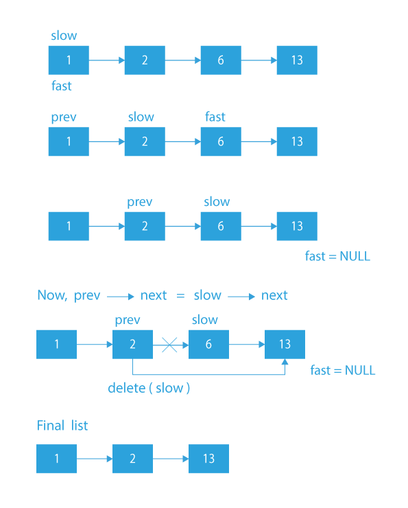 - Make the fast pointer take two steps and the slow pointer 1 step. In every iteration, before incrementing the slow pointer, we will store it in a temp variable.