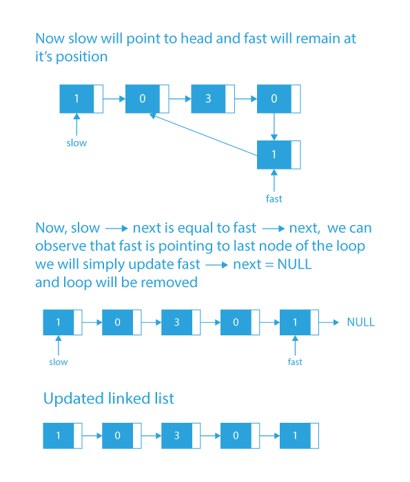 • So, in this case, we will run a while loop until fast->next != slow (inside loop move fast by one node at a time) and when fast->next == slow, we will remove the loop by making fast->next == NULL.
