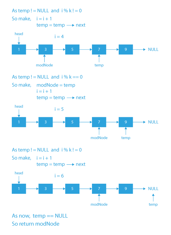 - We will take a pointer modNode and initialize it with NULL. This pointer will keep track of the last node whose i%k==0.