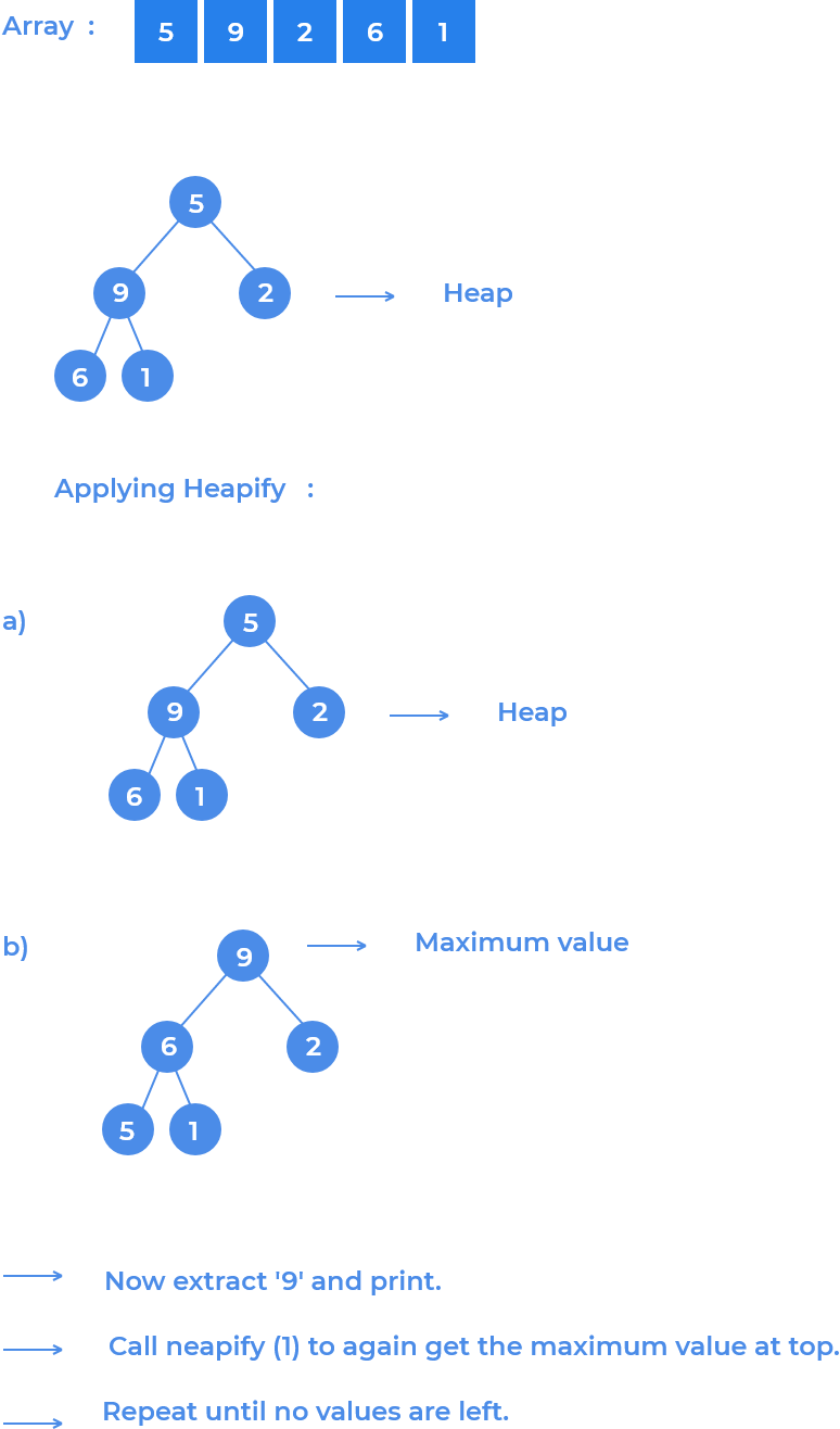 Idea is to create a min-heap then replace the root with the last element. Now that the least valued element is stored at the last position, we will heapify the remaining elements (or node) & repeat the process for all elements.