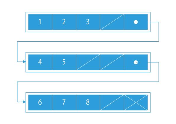 For example, in the first node, we have space for 5 elements, but we have filled with only 3 elements i.e 1 2 3, and similarly in the next node also we have space for 5 elements, but we have filled with only 2 elements.