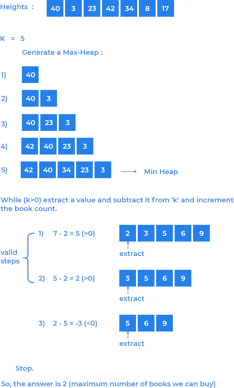• Insert the cost of the books in the heap. Now extract the costs, add them to S & also keep track of the number of books we are buying.