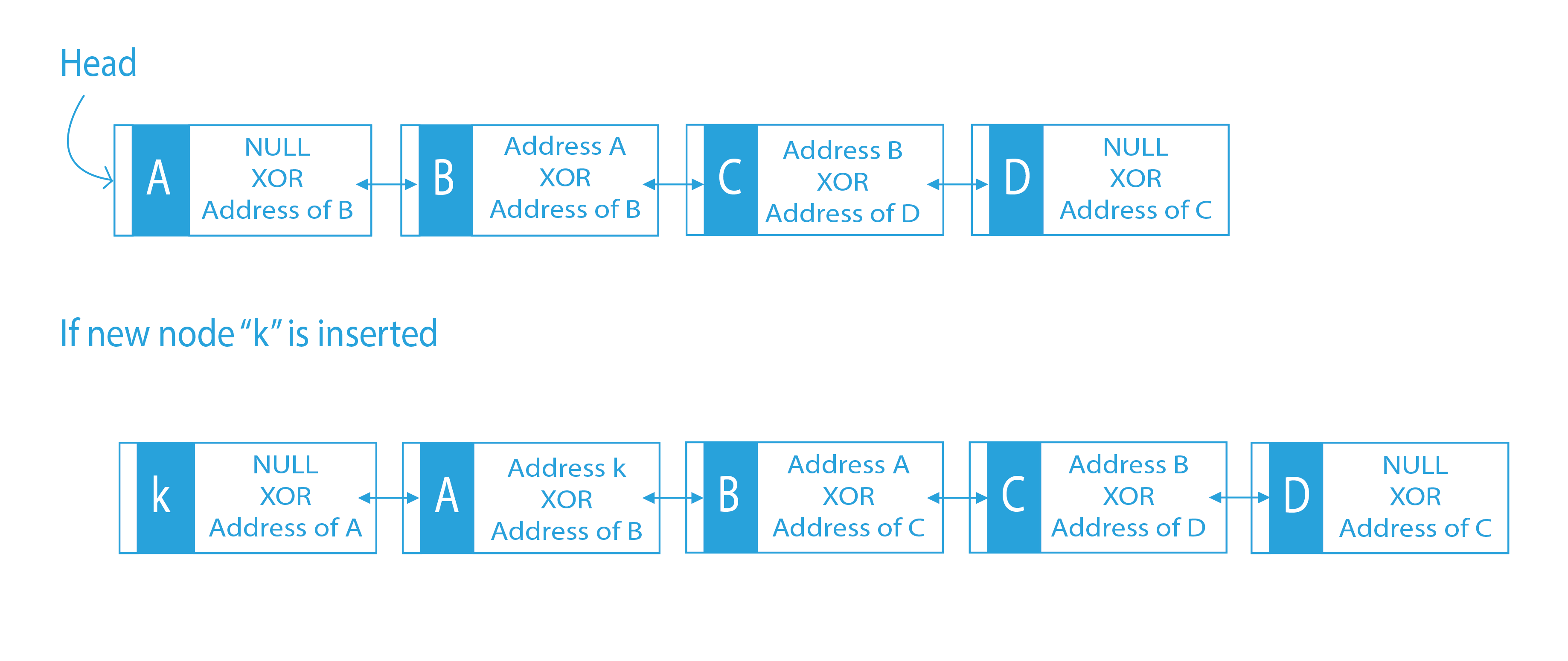- Store the address of the next node as address(previous) XOR address(current – > next).