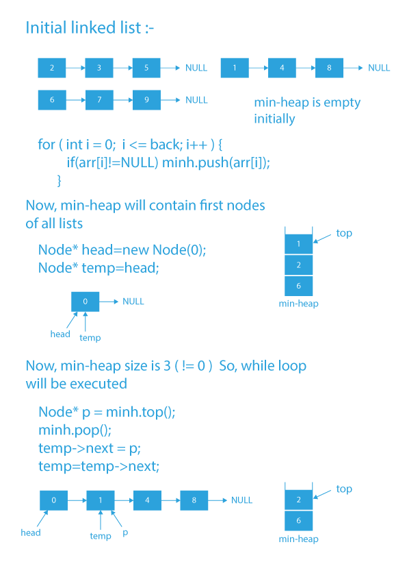 - Since the smallest elements are present at the beginning of each list as each of them is sorted, so, we need to insert each list’s first element in our heap.