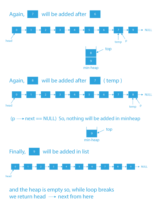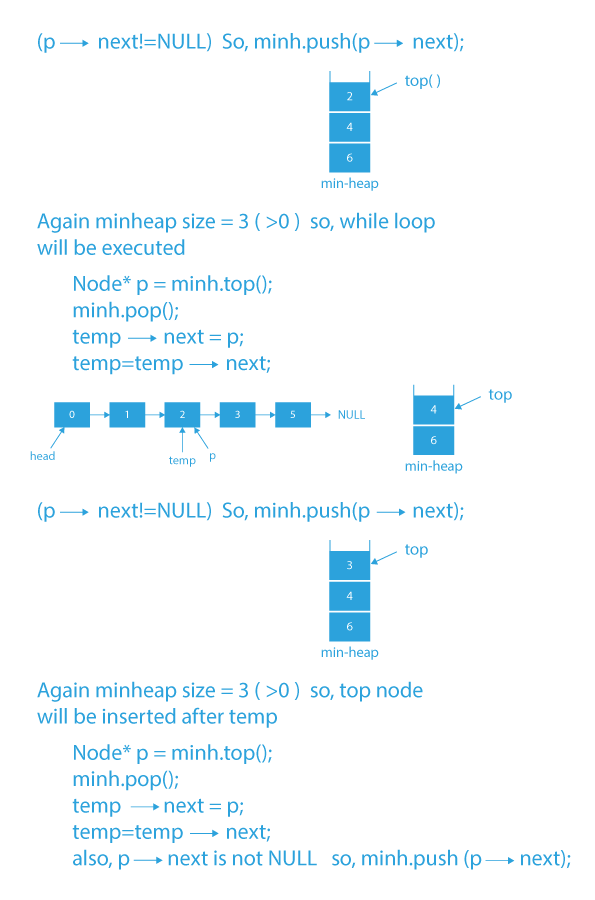 - If the node after p is not NULL, push the node after p into the priority queue.