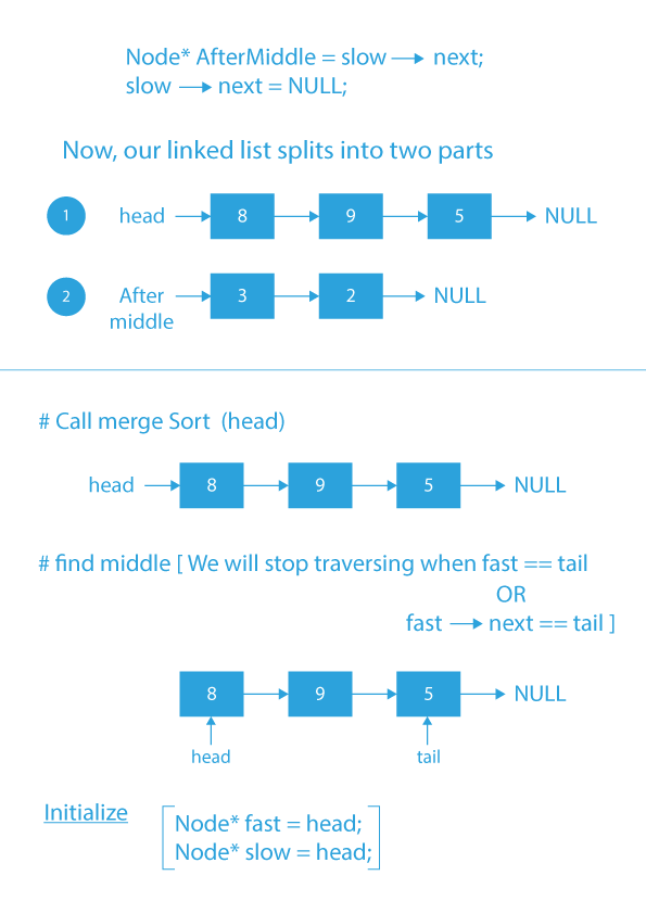 - Now, store slow → next in a pointer named afterMiddle and assign slow → next = NULL.
