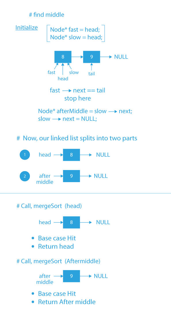 - If the head of the linked list is NULL or (head→ next == NULL), it shows that our linked list is of size 1 or 0 and a linked list of size zero or one is already sorted. So, Don’t do anything, just return head.