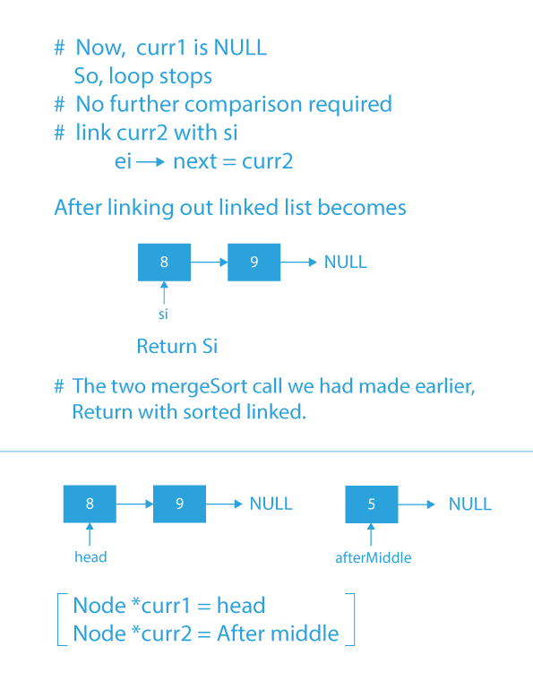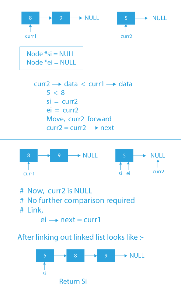 - Initialize two pointer variable named si and ei with NULL; these two pointer variables are the head and tail of the final sorted linked list.