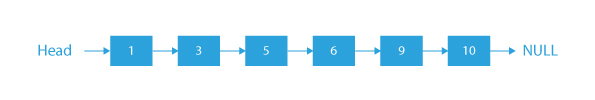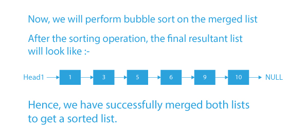 • After merging the two linked lists in the above example, the sorted linked lists will be head → 1 → 3 → 5 → 6 → 9 → 10 → NULL.