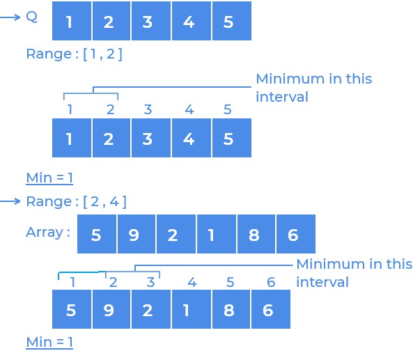 a[i]for any indexi. Now for every range sayltor, we will store the minimum value of this range in the node.Now that our tree is constructed, we will answer queries (minimum value in the given range). The queries can be of