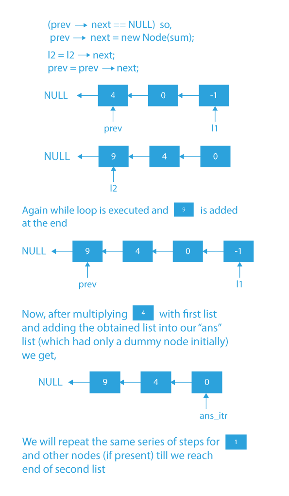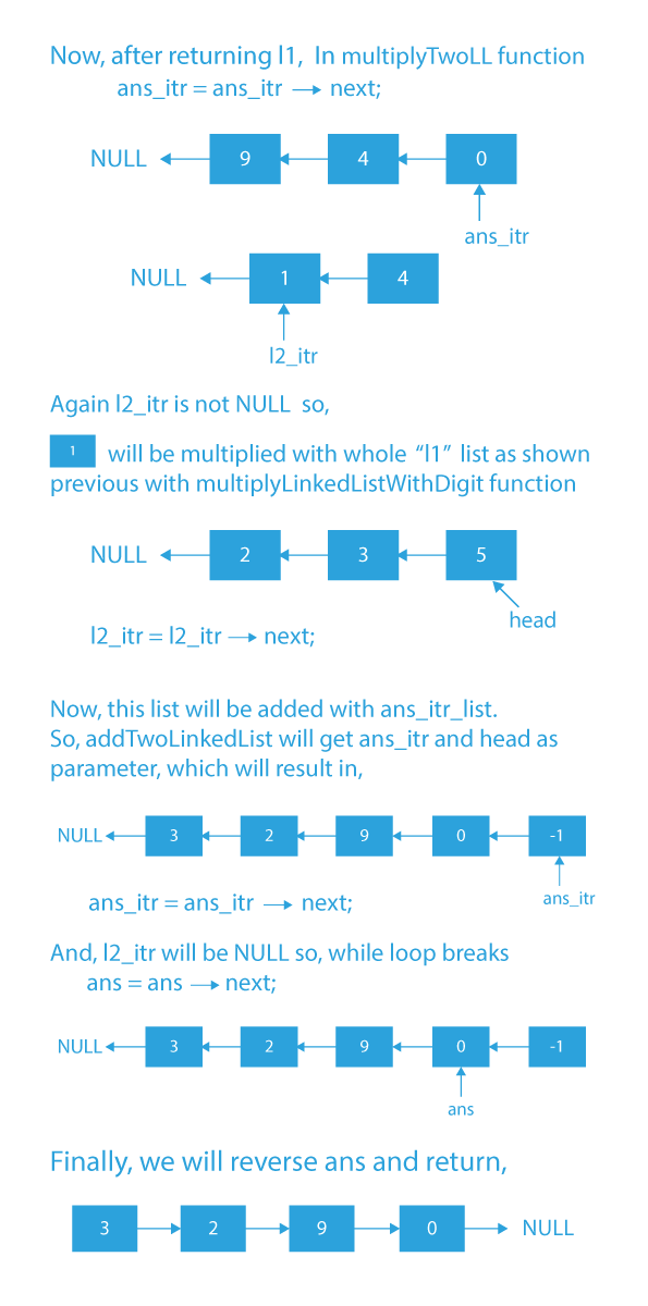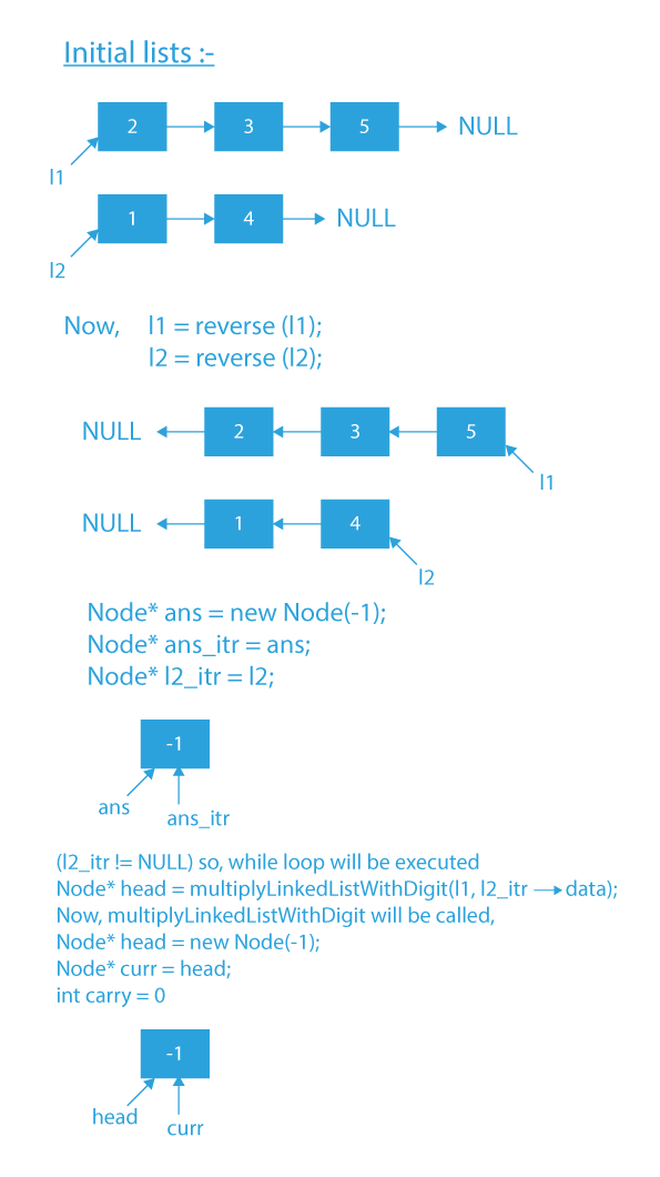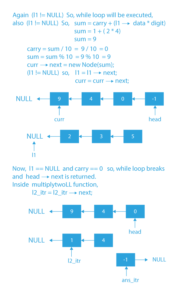 - Create a head pointer that will call multiplyLinkedListWithDigit function with l1 and l2_itr->data as parameters. (This function will multiply the single digit of the second list’s node with the complete first list).