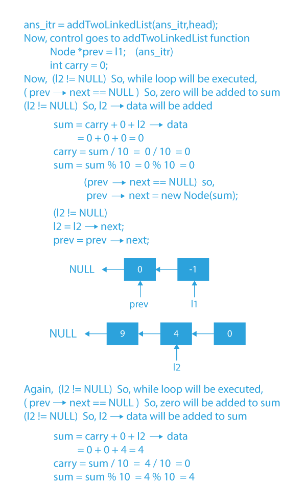 - Calculate sum by adding carry, prev->next->data if prev->next is not NULL and l2->data if l2 is not NULL.