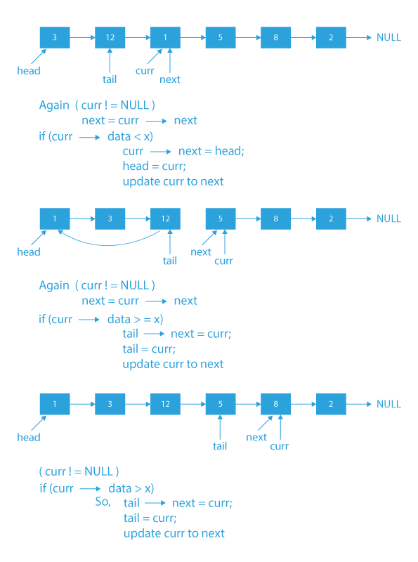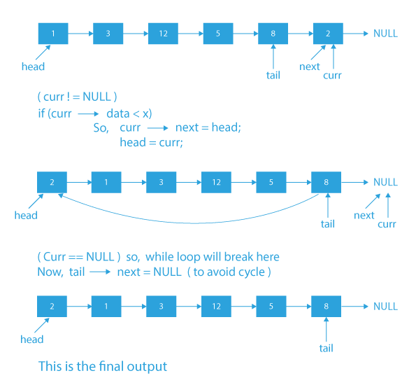 - When we encounter an element that is less than X, we will insert it before the head and update the head pointer.