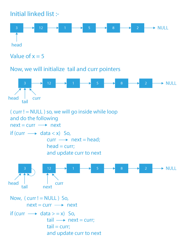 - When we encounter an element greater than or equal to X, we will insert it after the tail node and will update the tail node.
