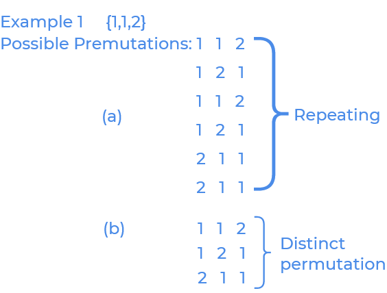 nelements withdsimilar elements there aren!/m!different permutations. For example, there are3permutations of the set {1,1,2}, namely [1,1,2], [1,2,1], [2,1,1].