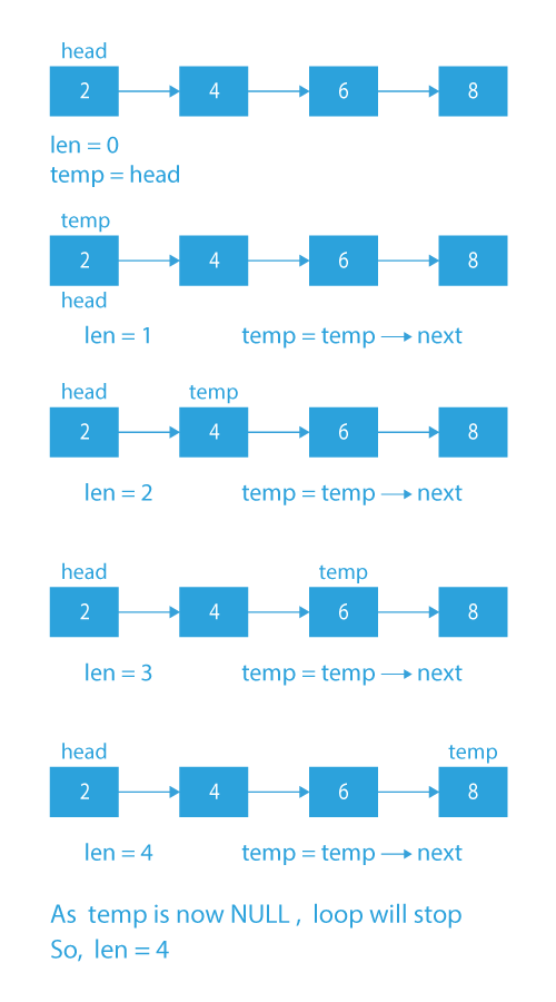 Now, traverse the list with the help of temp and keep incrementing len by 1 for every node.