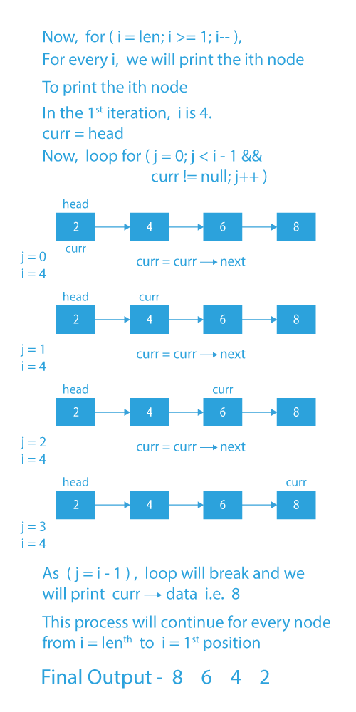 - First, we will print the 4th node, then the 3rd, then the 2nd and finally the 1st node.
