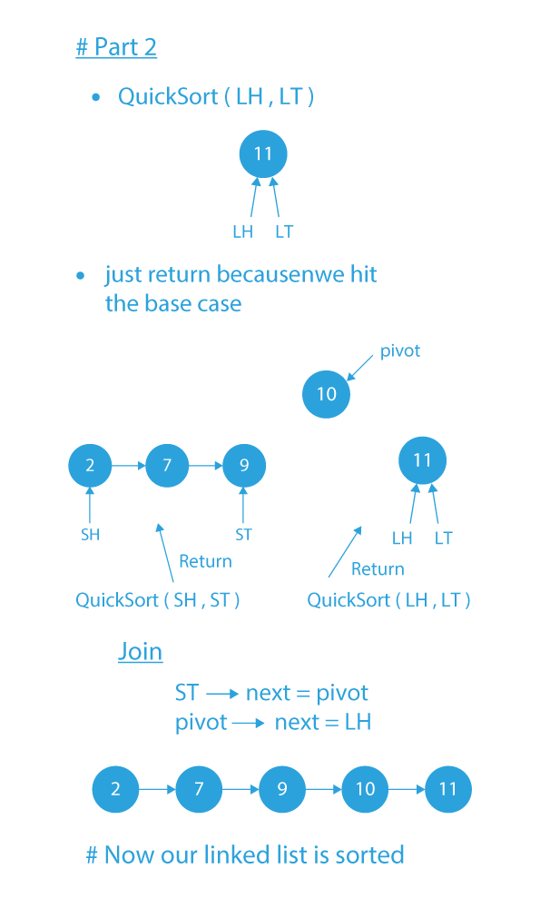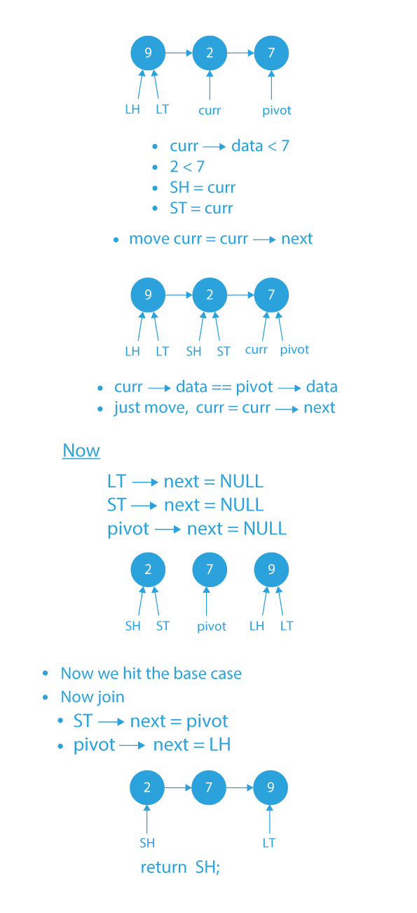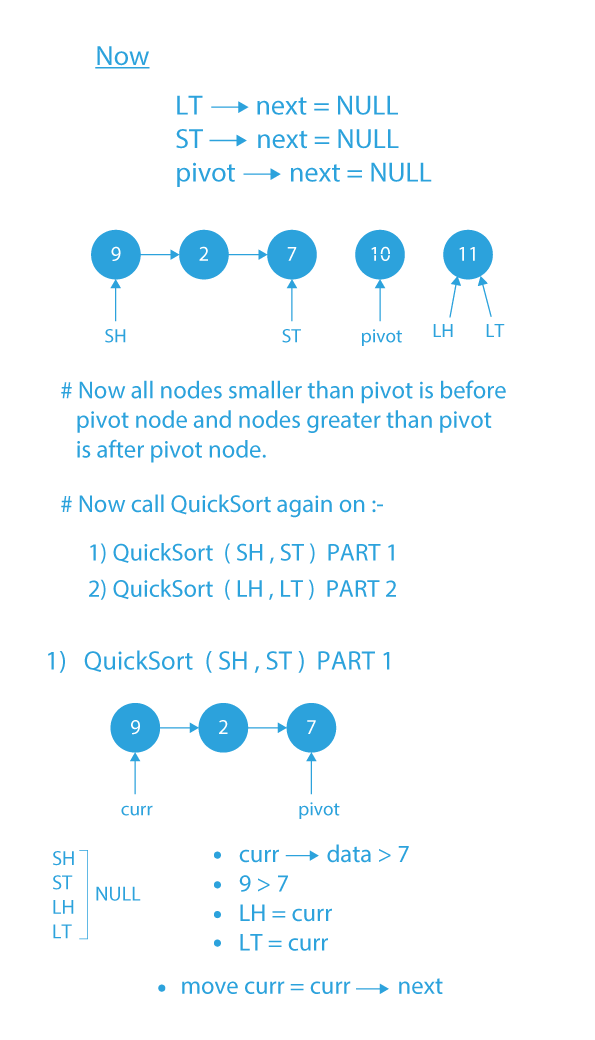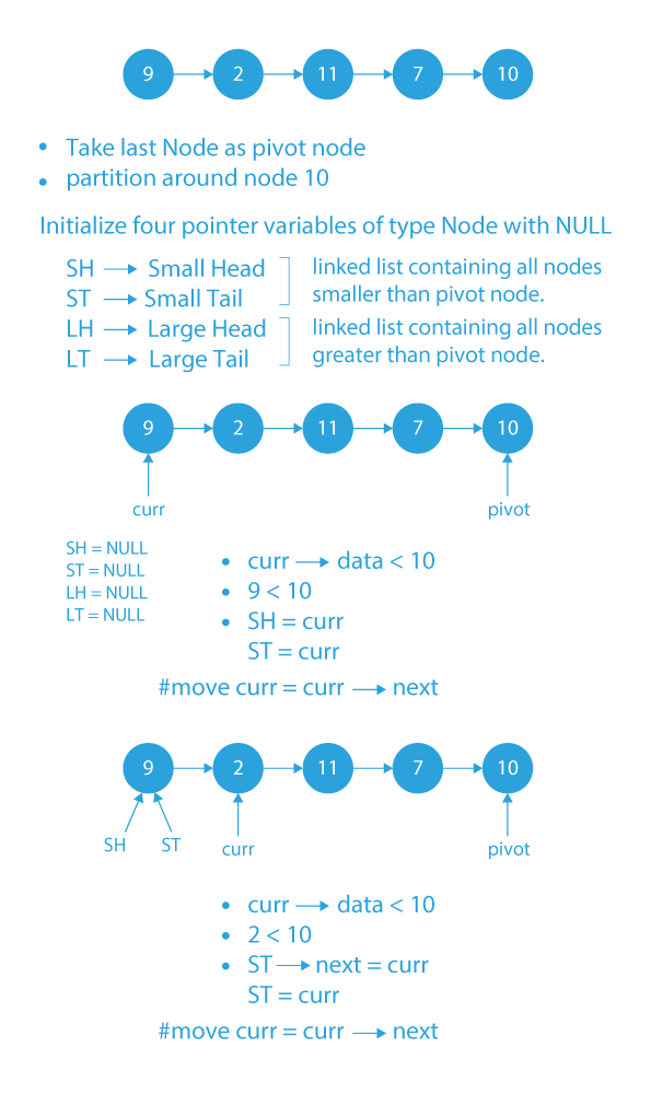 - The partition function will update 5 pointers that point to the pivot, head and tail pointer of linked list containing all nodes smaller than pivot and head and tail pointer of a linked list containing all nodes greater than the pivot.