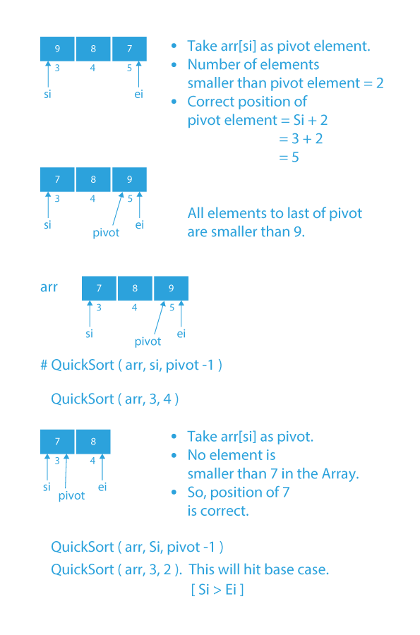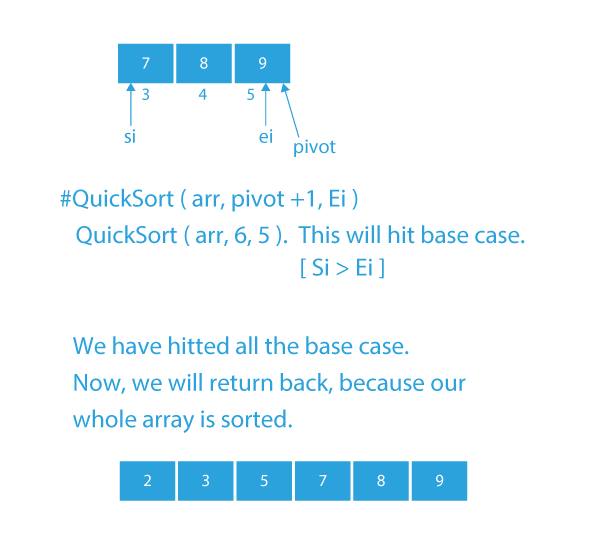 - After this, we will call Quicksort again on the elements from starting index to pivot-1 and pivot+1 to the end index. We will continue to call Quicksort till we hit the base case.