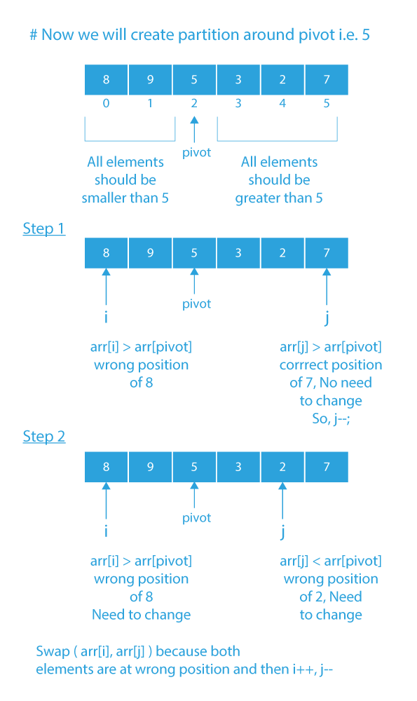 - We can choose any element as a pivot element, e.g. starting element of the array, last element of the array, middle element of the array, etc.