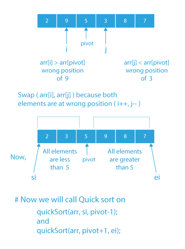 - After this, we will call Quick sort again on the elements from starting to pivot-1 and pivot+1 to the end.