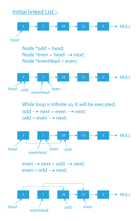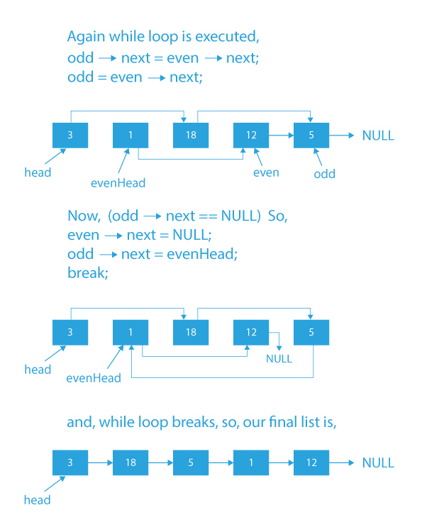 - If the node next to odd is NULL (i.e., no node after the current odd node), then update the next of even as NULL and attach the tail of odd to the head of even and break from the loop.