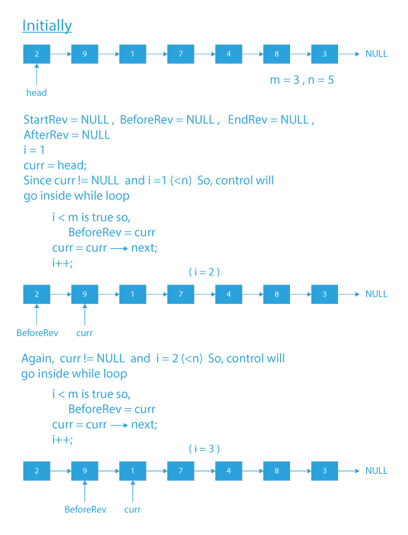 - Initialize four pointers named StartRev, BeforeRev, EndRev, AfterRev with NULL and an integer variable i with 1.