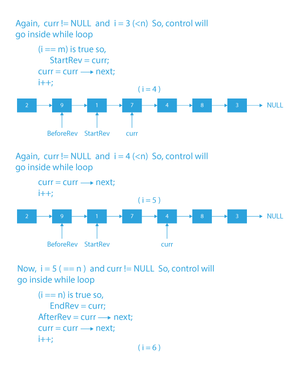 - If i is equal to n, update EndRev with curr and AfterRev with curr->next.