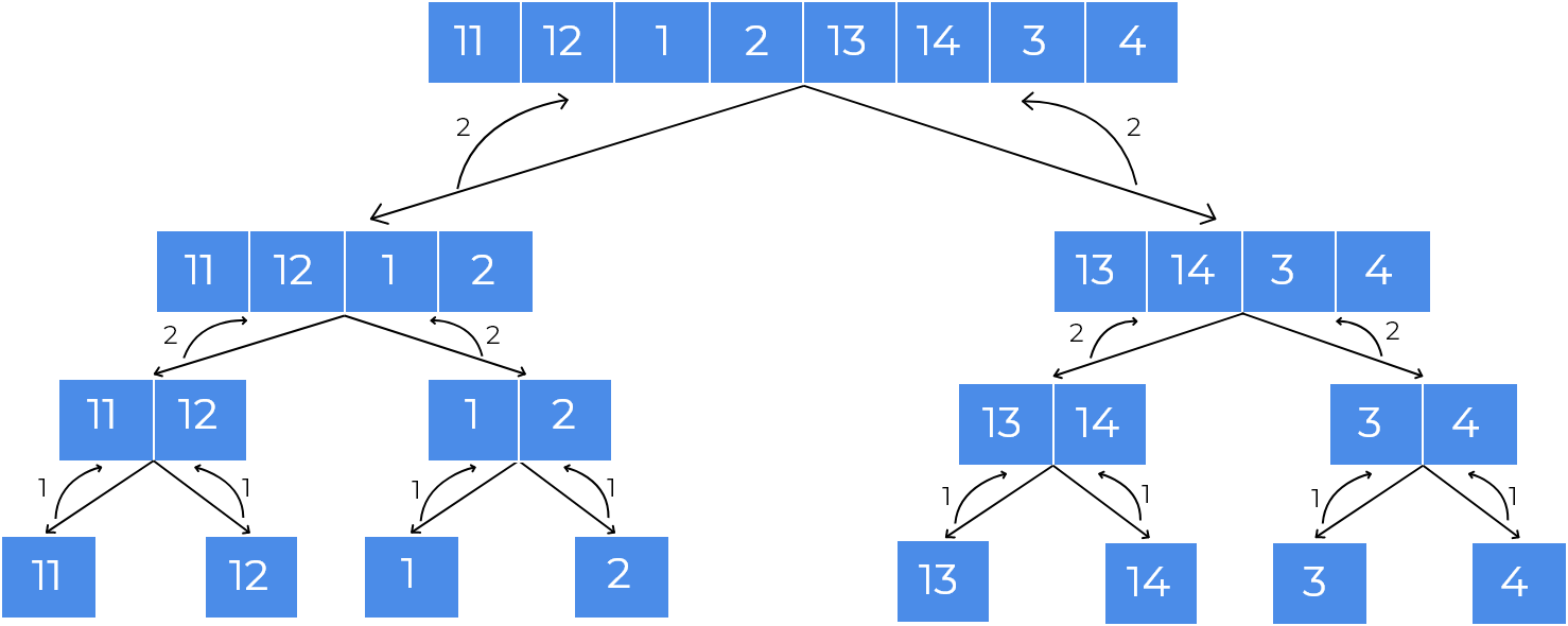 1) We can use recursion to solve this problem, by dividing the current array into two halves recursively and return 1 when the array size is 1 as an array of size 1 is already sorted.