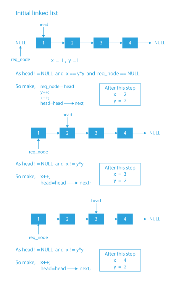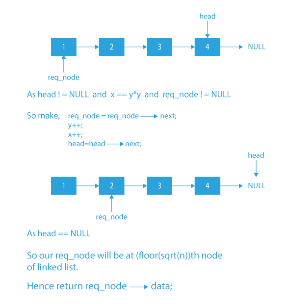 - Now, when we reach the last node of the list x will contain the value of n, y will contain the value of sqrt(x) and req_node will point to the node at yth position.